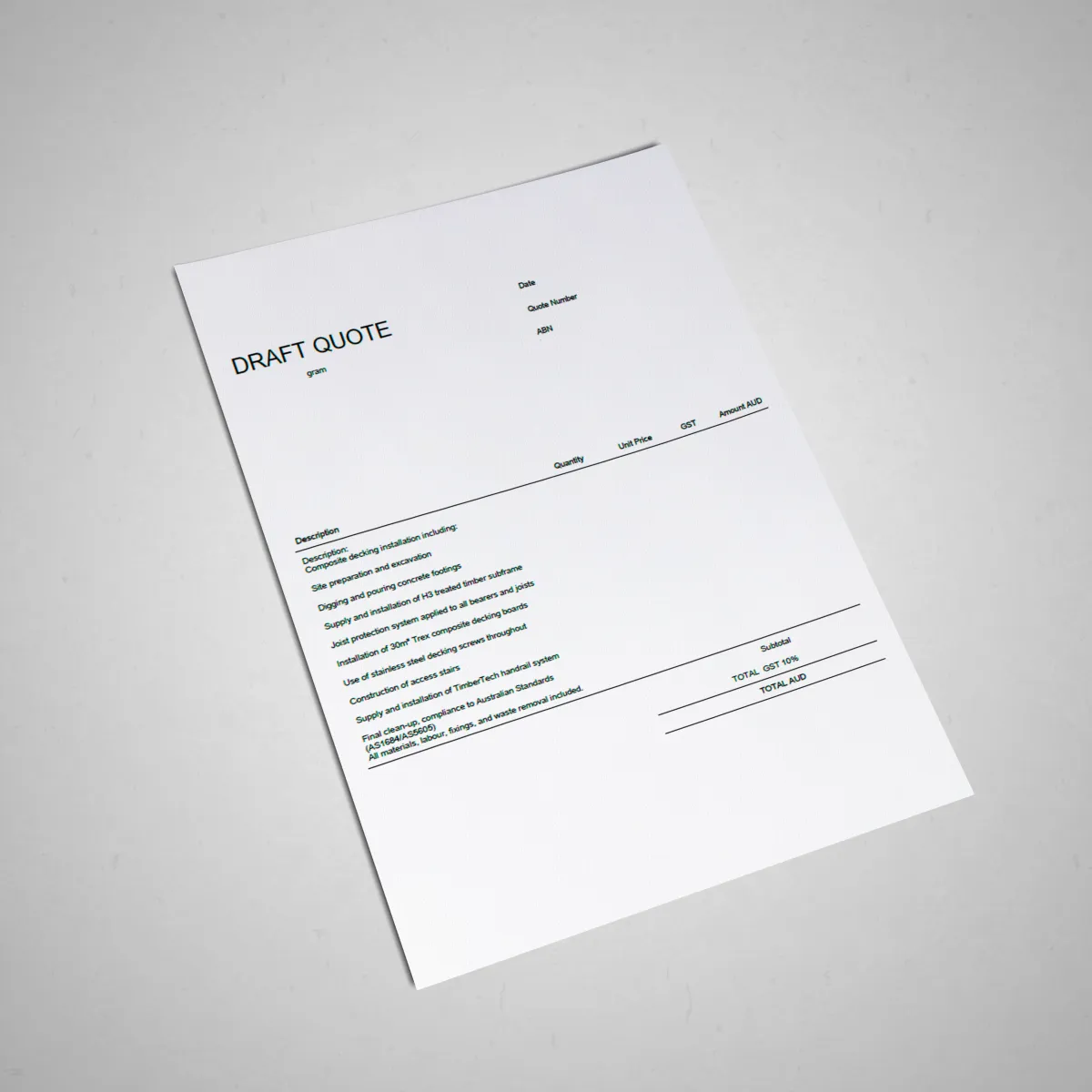 Stop wasting hours formatting quotes in Word or sending unprofessional handwritten estimates. Tradie Quote Designer creates premium, branded quote documents that impress clients and help you stand out from competitors — all within 24 hours.